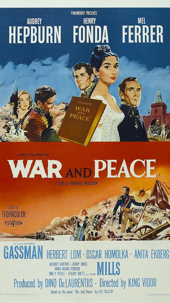 • Americký film Vojna a mír vznikl podle stejnojmenné předlohy spisovatele Lva Nikolajeviče Tolstého, která patří k nejrozsáhlejším románovým skladbám světové literatury. Vystupuje zde více než 250 postav hlavních a epizodických, ale obtížnost tohoto díla spočívá hlavně v tom, že zachycuje složitý společensko-historický vývoj. Odehrává se v době napoleonských válek a předkládá také vojensko-politický pohled na širší evropskou scénu. První část téměř tříhodinového snímku zachycuje události v letech 1805–1812, mezi dvěma Napoleonovými ruskými taženími. V období mezi těmito válkami prožilo Rusko několikaleté období nejistého míru. Hrdinové procházejí řadou důležitých změn. Nataša Rostovová vyrostla z vytáhlého dítěte v neobyčejně hezkou dívku a zažívá několik milostných vzplanutí. Nakonec svoji největší lásku, knížete Andreje Bolkonského, zrazuje pro obyčejného, rozmařilého světáka Anatola Kuragina. Pierre Bezuchov se stává dědicem ohromného jmění a bez lásky si bere za ženu krásnou Helenu Kuraginovou. Jejich vztah se po svatbě brzy hroutí. Pro nevěru své ženy se bije v souboji s bezohledným důstojníkem Dolochovem. Andrej Bolkonský zůstává těžce zraněn v bitvě u Slavkova a vyrovnává se se smrtí manželky, která zemřela při porodu... Film natočil významný tvůrce a klasik americké kinematografie King Vidor (Ecce Homo!, Chléb náš vezdejší, Texaští jezdci, Souboj na slunci), který musel zachytit neustále se prolínající dějová pásma literární předlohy. S citem ukazuje vysokou aristokracii, scény utrpení ruských hrdinů, jeho mistrovství se však projevuje hlavně v bitevních scénách. Film se natáčel pro americkou distribuční společnost Paramount v Itálii a dohled známých producentů Dina De Laurentiise a Carla Pontiho ovlivnil i mezinárodní složení tvůrců. Hudbu napsal známý filmový skladatel Nino Rota, za obrazovou část ručil britský kameraman Jack Cardiff. Křehkou a půvabnou Natašu Rostovovou ztvárnila Audrey Hepburnová (u nás známá z komedií Prázdniny v Římě a Snídaně u Tiffanyho). Úlohu nevyrovnaného, rozevlátého Pierra Bezuchova ztěsnil Henry Fonda, knížete Andreje Bolkonského hraje Mel Ferrer, jenž byl v soukromí několik let partnerem Hepburnové. Roli světáka Anatola Kuragina představuje Ital Vittorio Gassman, lehkovážnou a nevěrnou Helenu Kuraginovou vytvořila švédská filmová hvězda Anita Ekbergová (svůj největší herecký úspěch dosáhla ve Felliniho Sladkém životě).